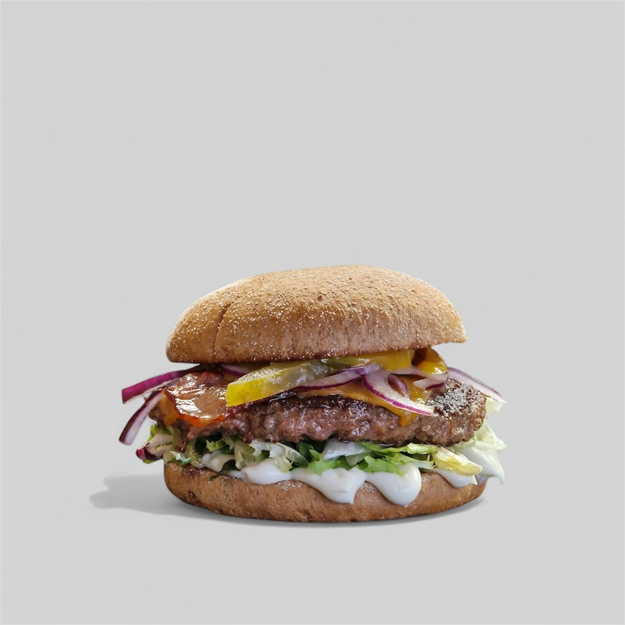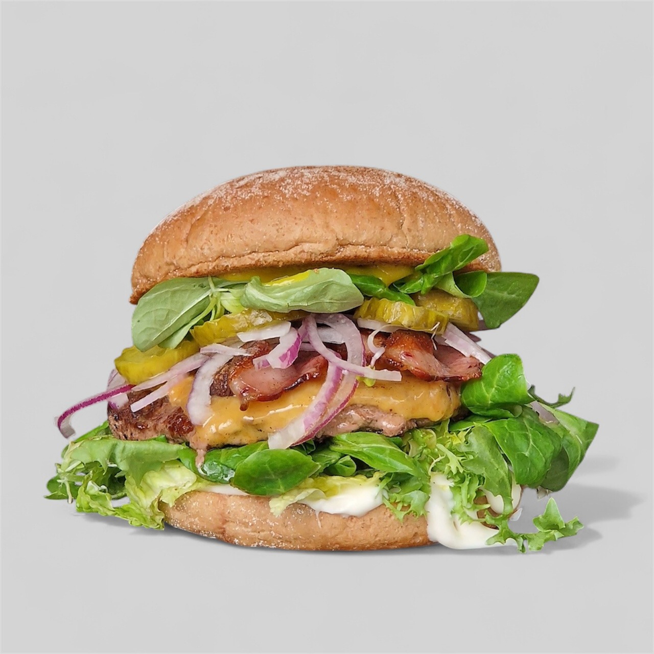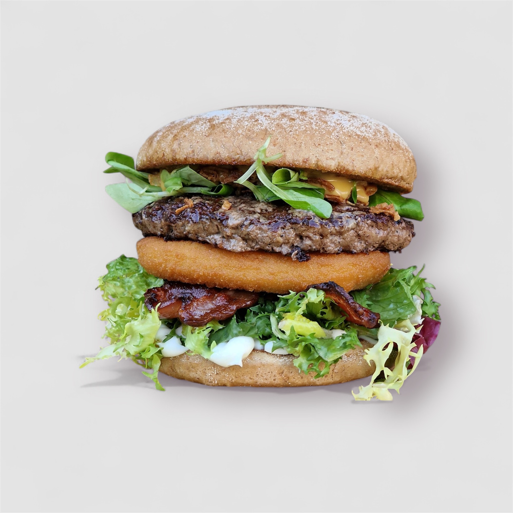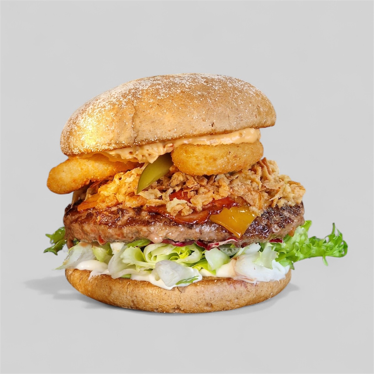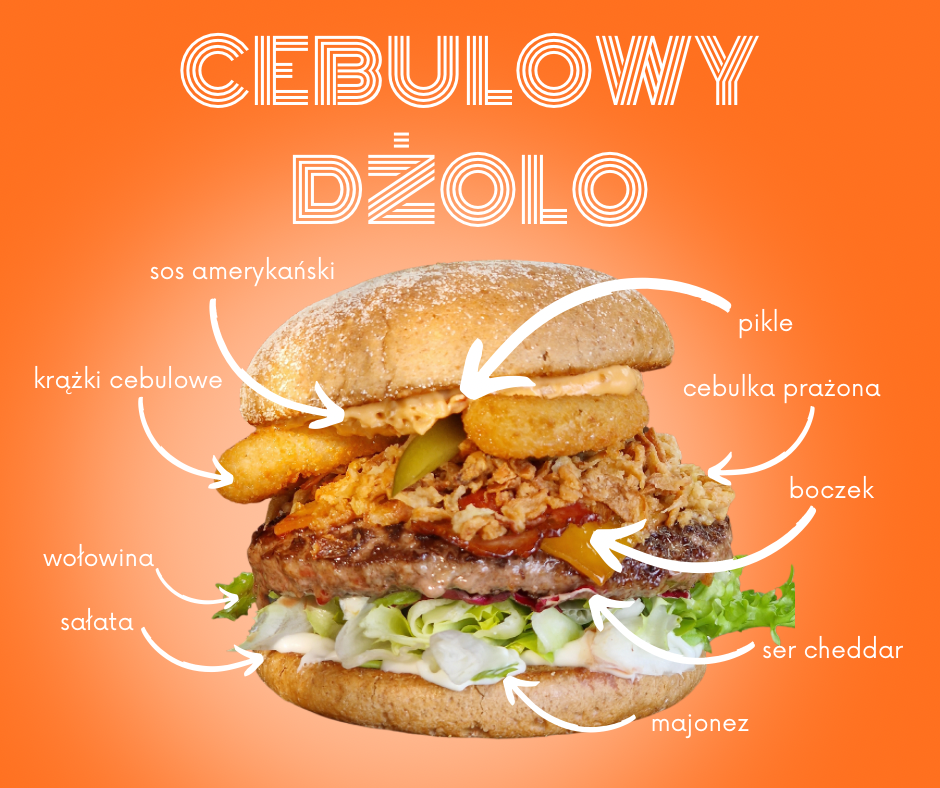 MIĘSO WOŁOWE, KRĄŻKI CEBULOWE, CEBULKA PRAŻONA, PIKLE, SER CHEDDAR, BOCZEK, SAŁATA, MAJONEZ, SOS AMERYKAŃSKI