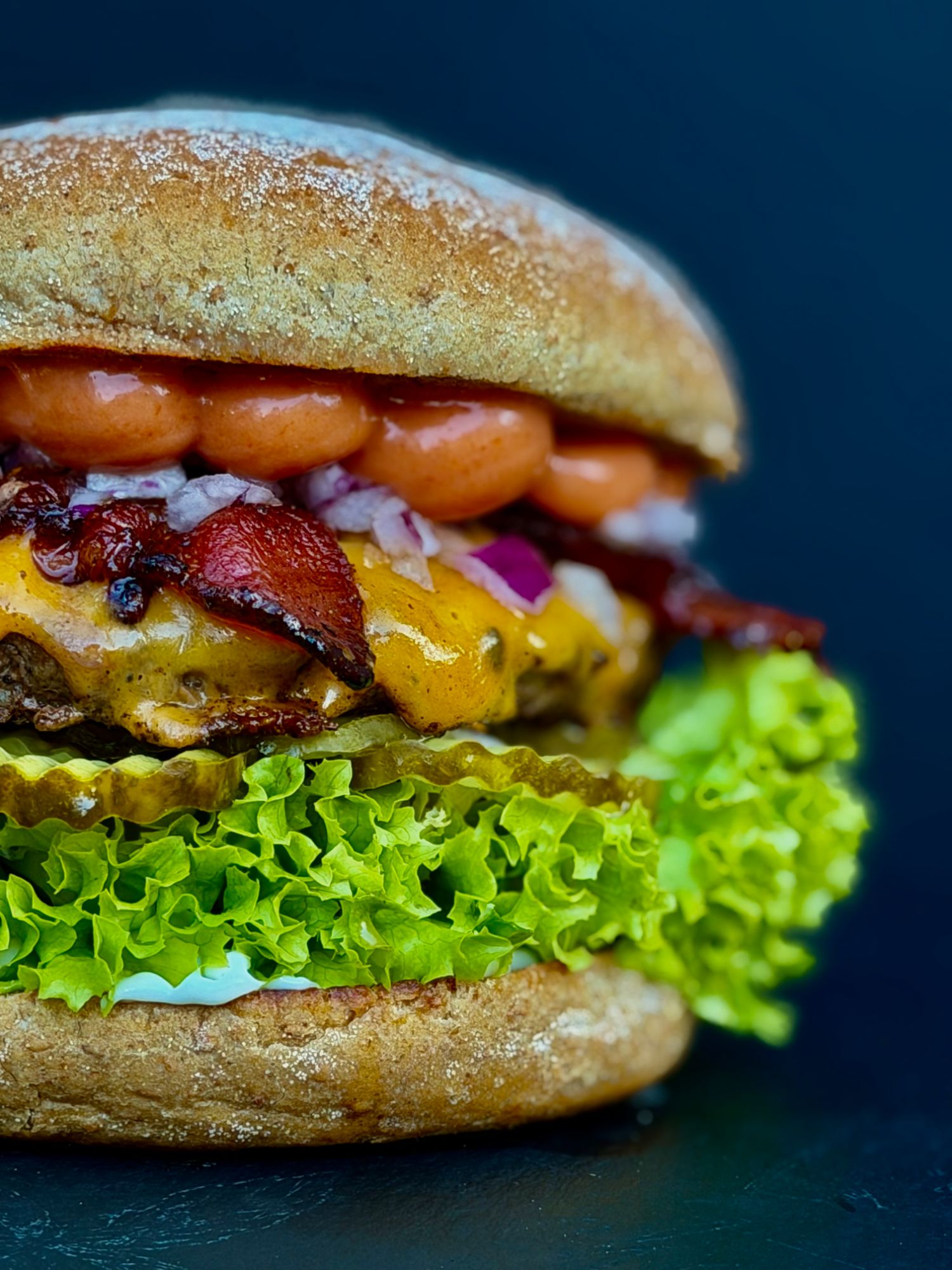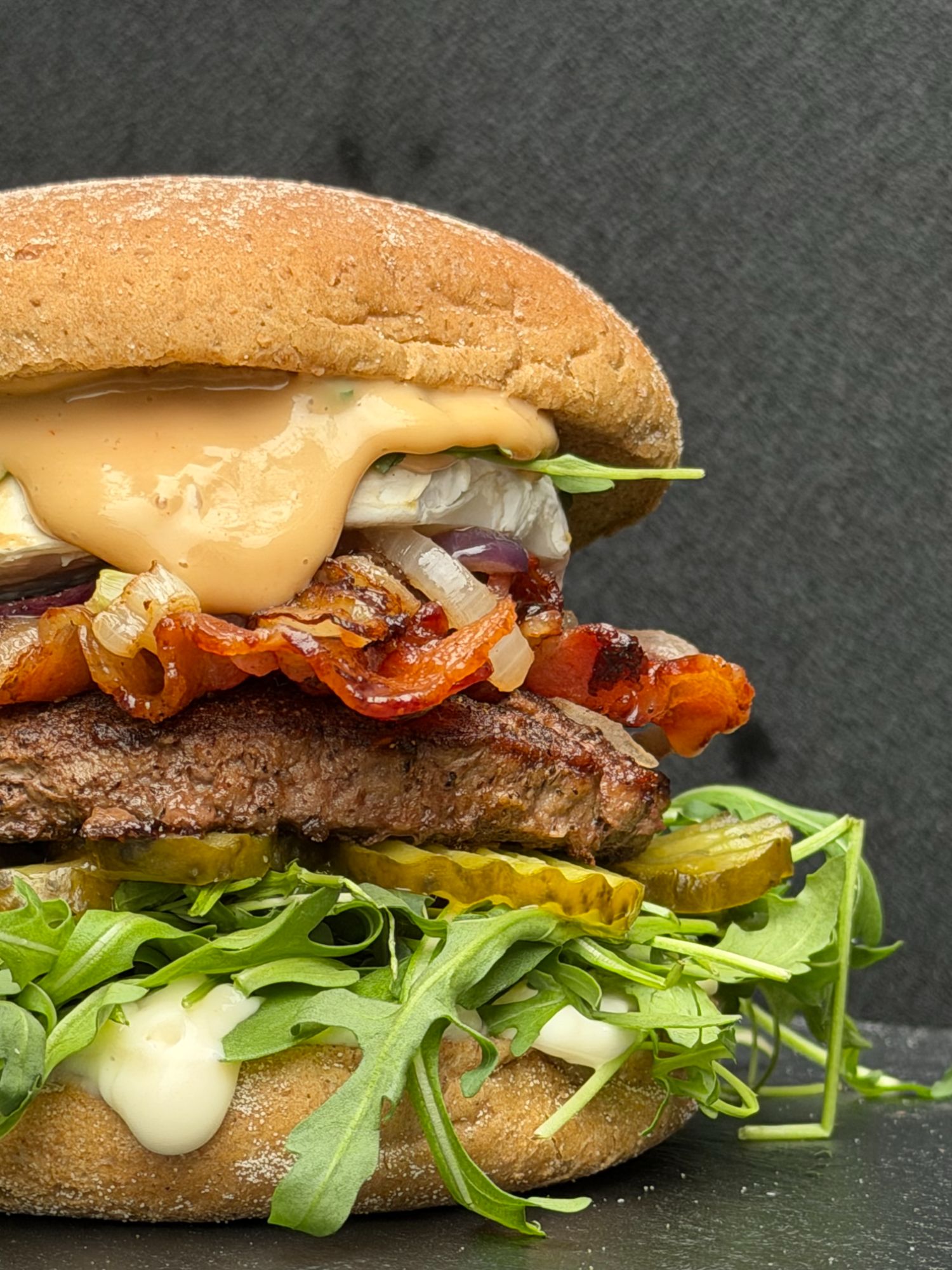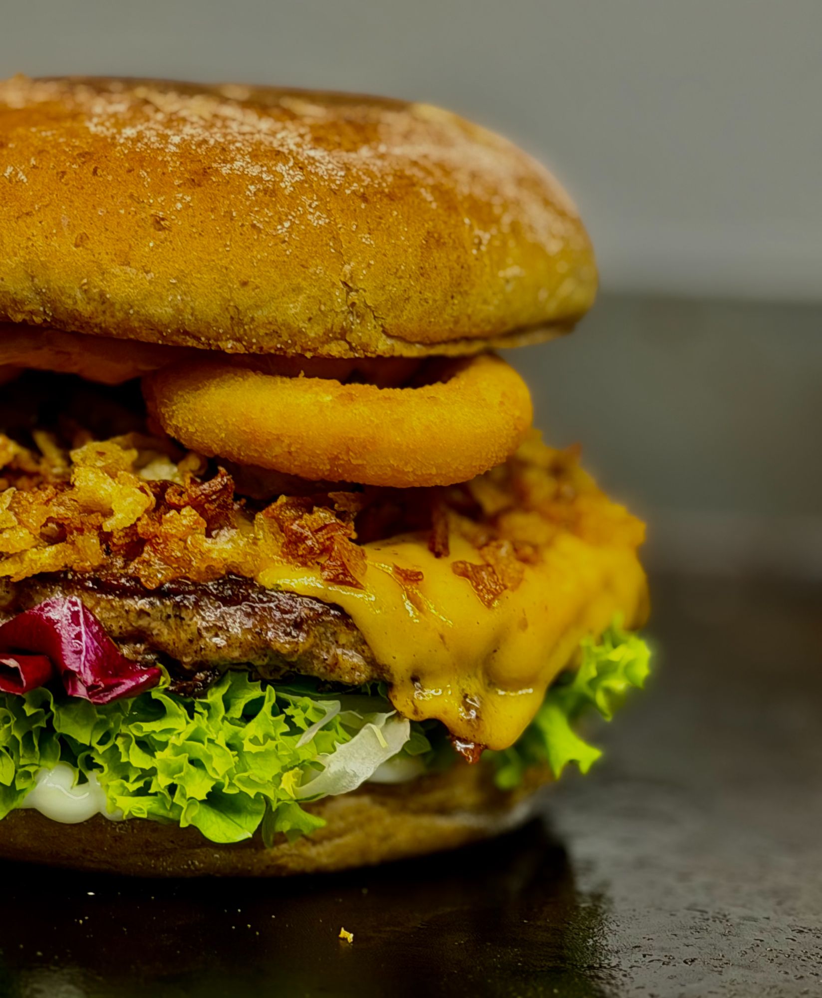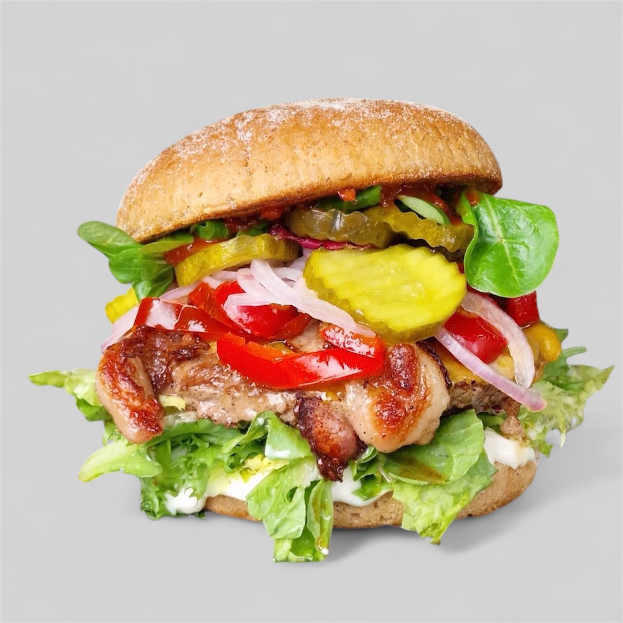 MIĘSO WOŁOWE, KRĄŻKI CEBULOWE, CEBULKA PRAŻONA, PIKLE, SER CHEDDAR, BOCZEK, SAŁATA, MAJONEZ, SOS AMERYKAŃSKI
