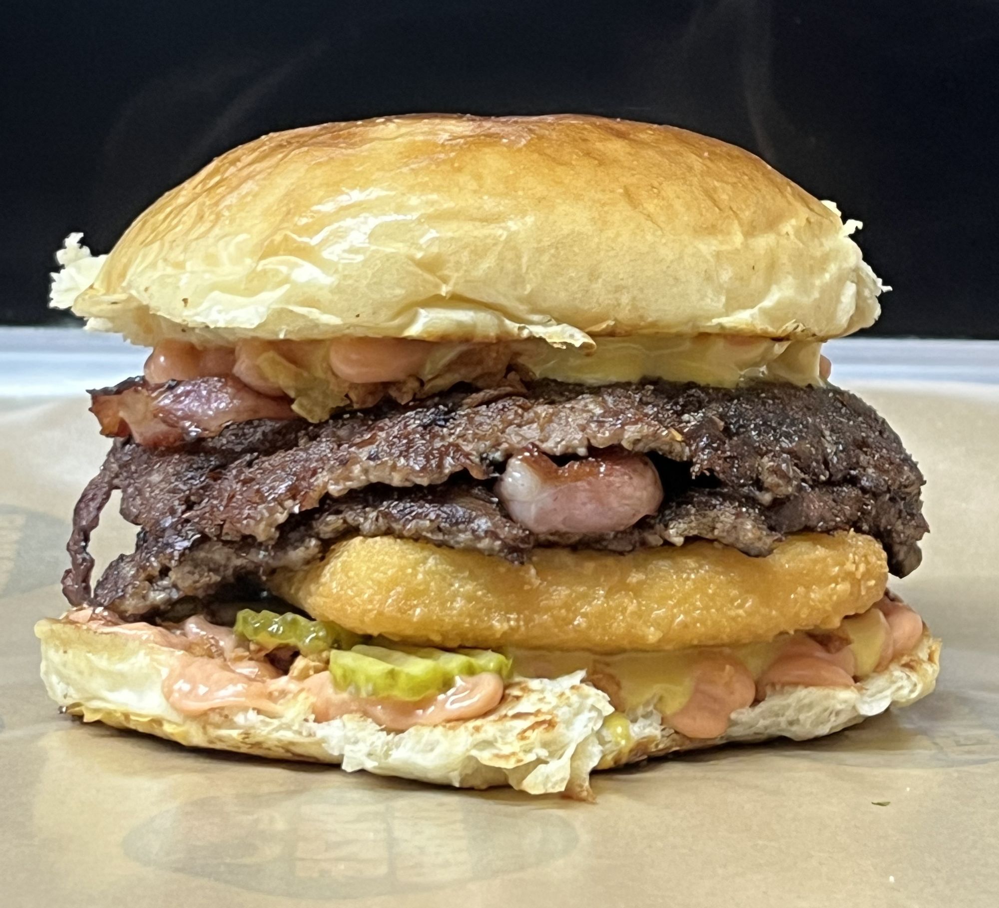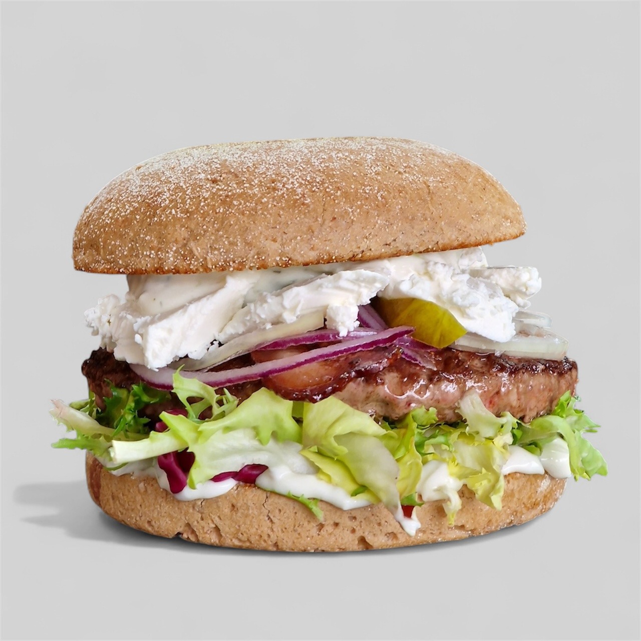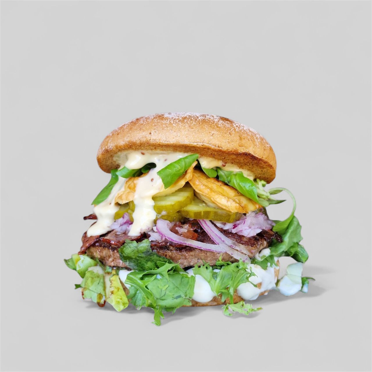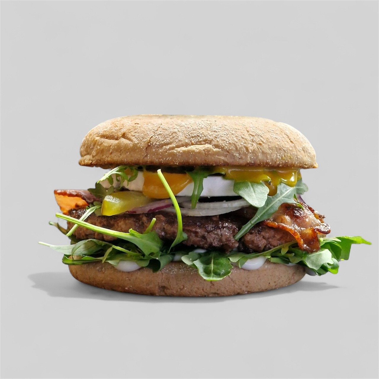 MIĘSO WOŁOWE, KRĄŻKI CEBULOWE, CEBULKA PRAŻONA, PIKLE, SER CHEDDAR, BOCZEK, SAŁATA, MAJONEZ, SOS AMERYKAŃSKI