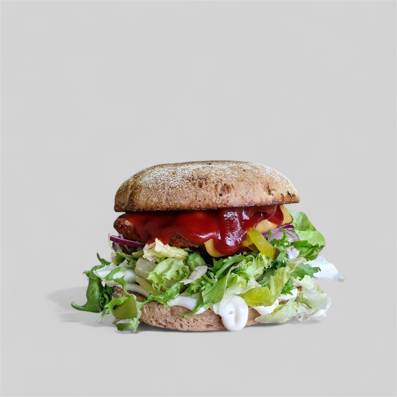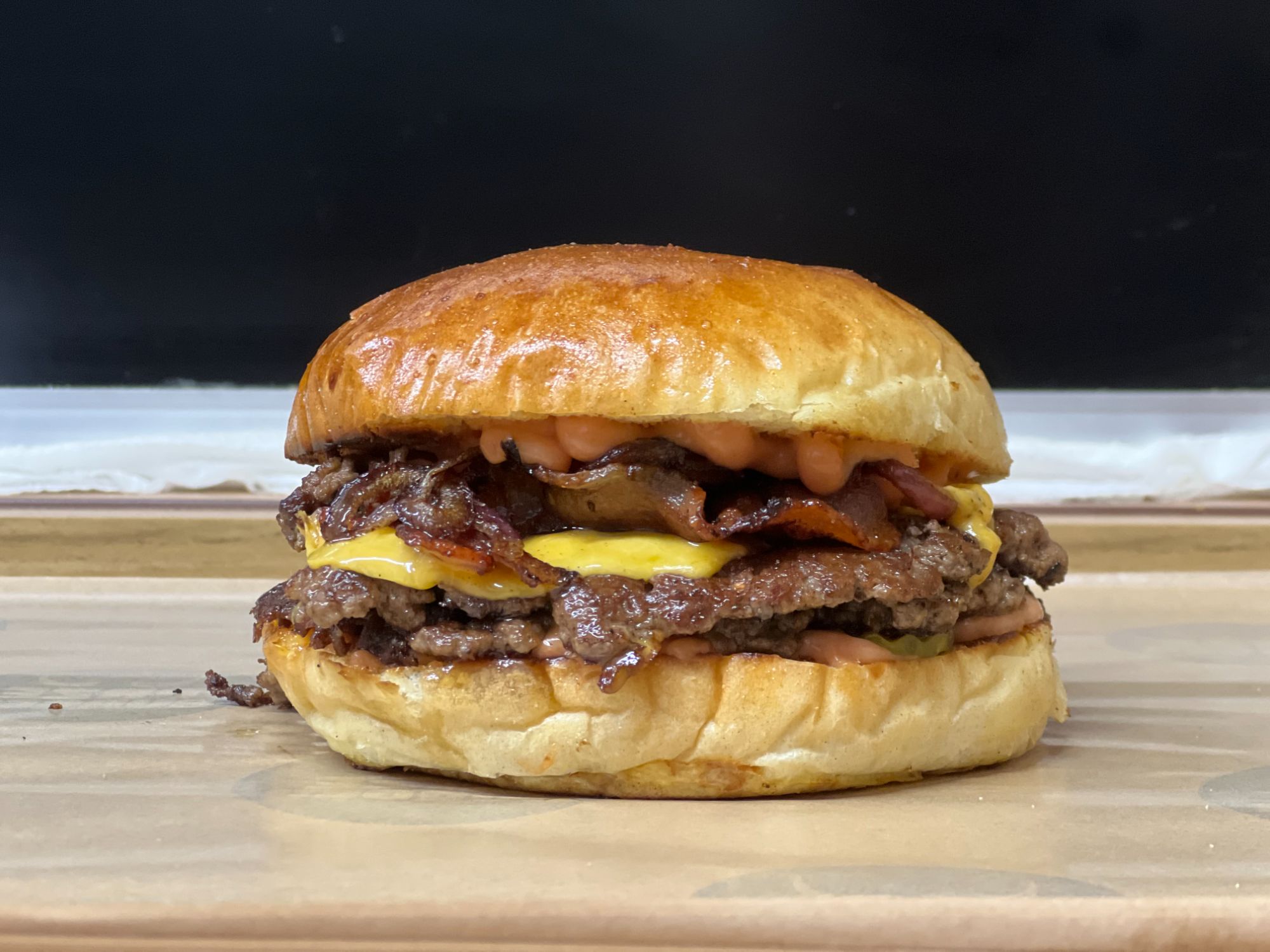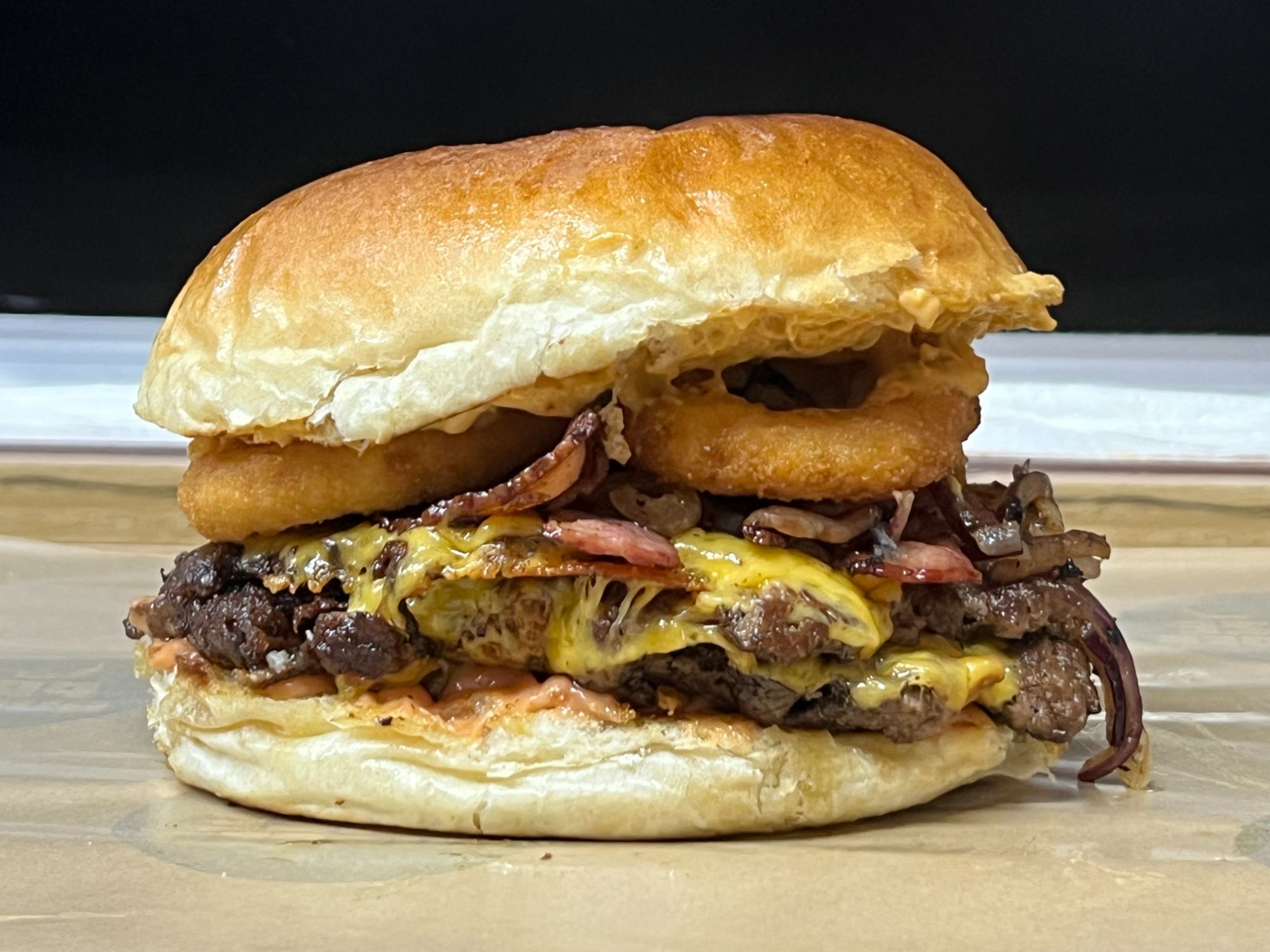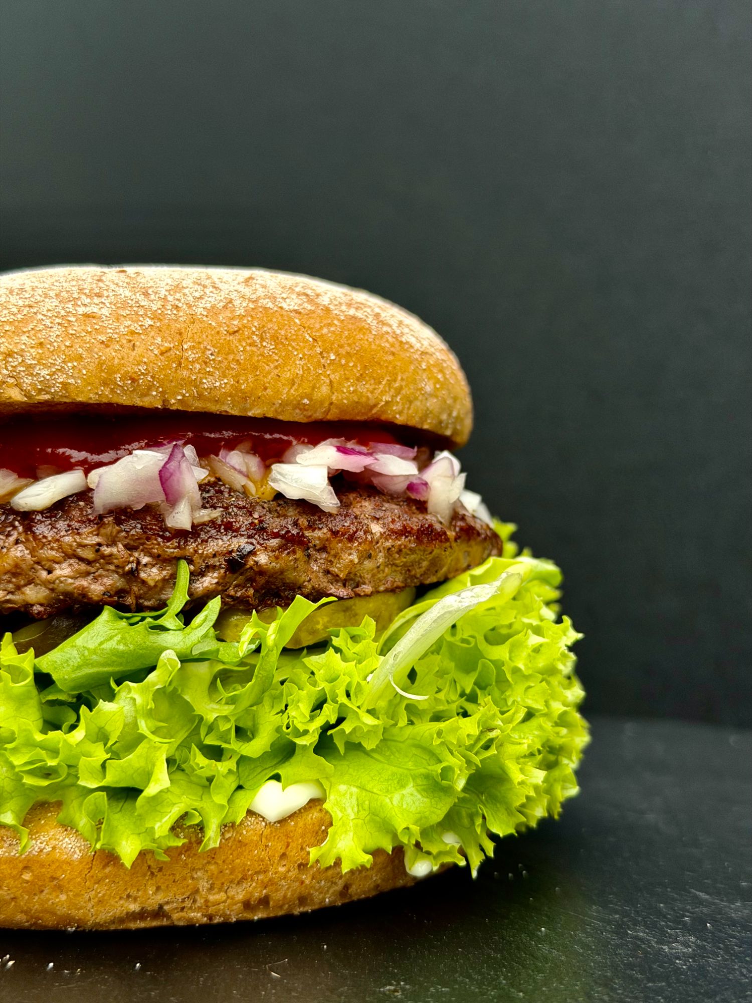 MIĘSO WOŁOWE, KRĄŻKI CEBULOWE, CEBULKA PRAŻONA, PIKLE, SER CHEDDAR, BOCZEK, SAŁATA, MAJONEZ, SOS AMERYKAŃSKI