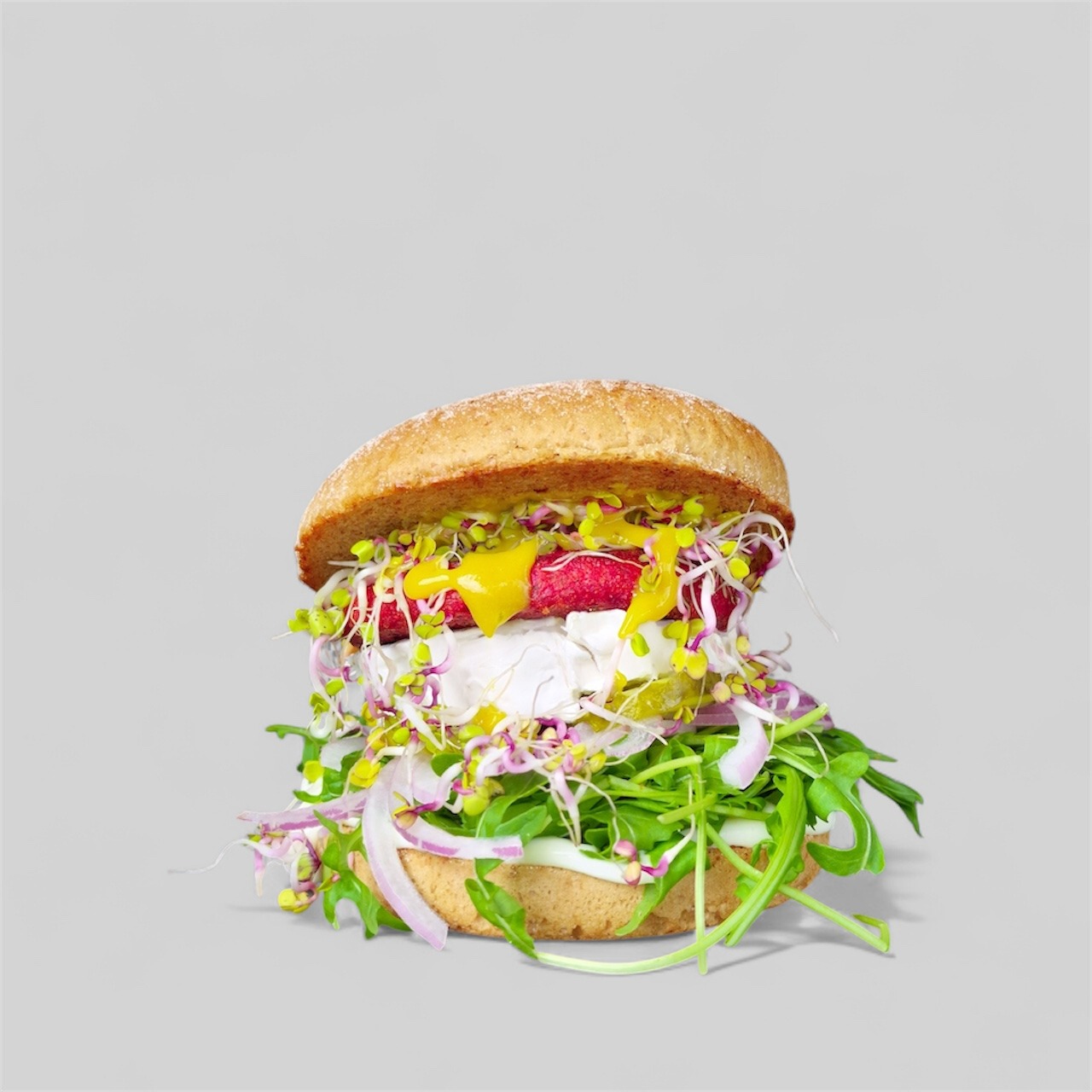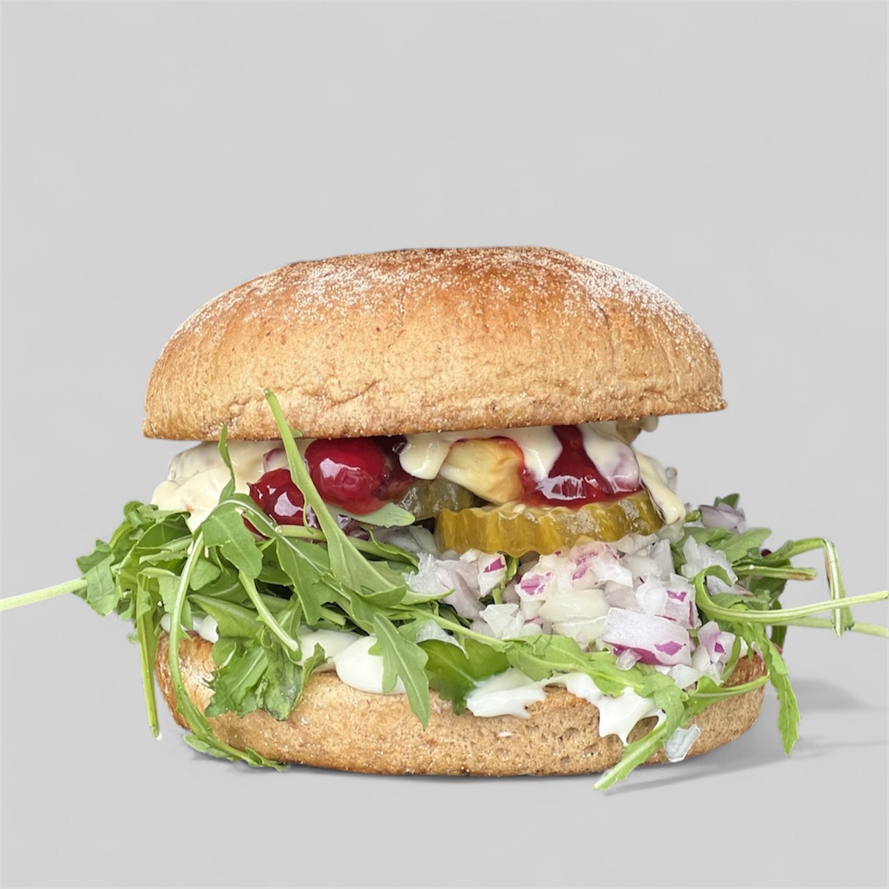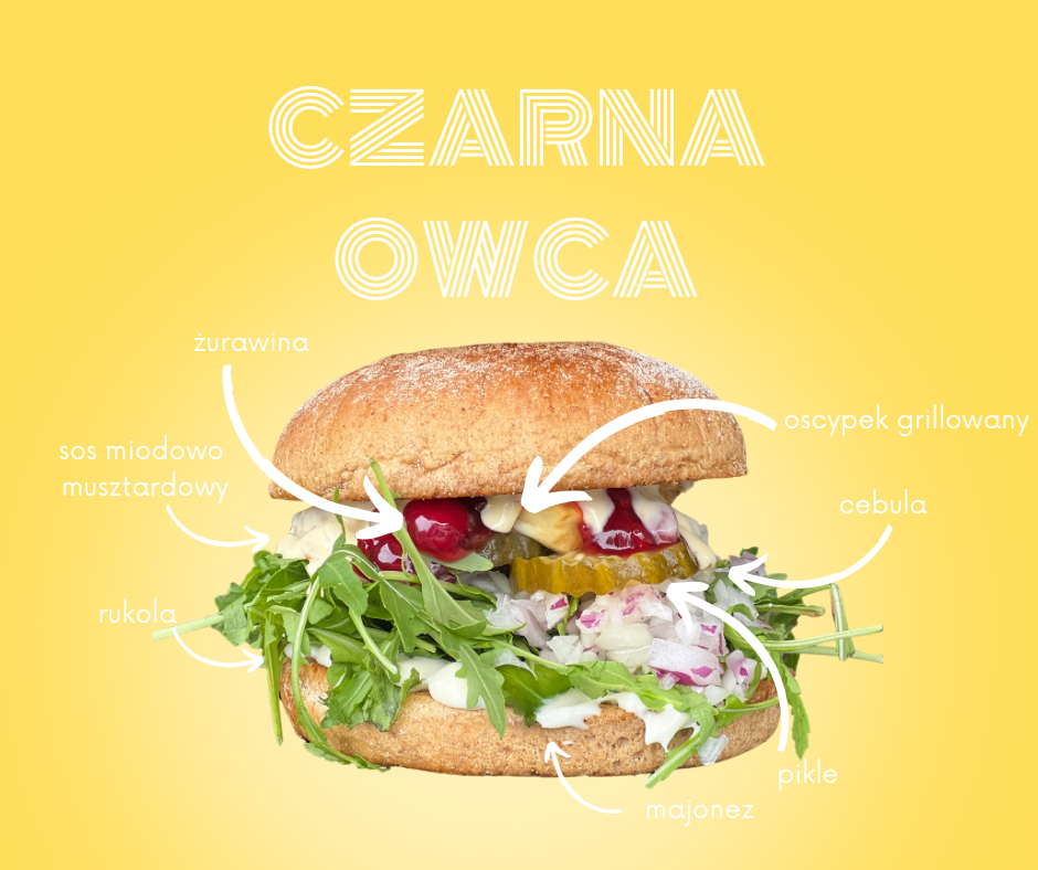 OSCYPEK GRILOWANY, ŻURAWINA, CEBULA, PIKLE, RUKOLA, MAJONEZ, SOS MIODOWO MUSZTARDOWY
