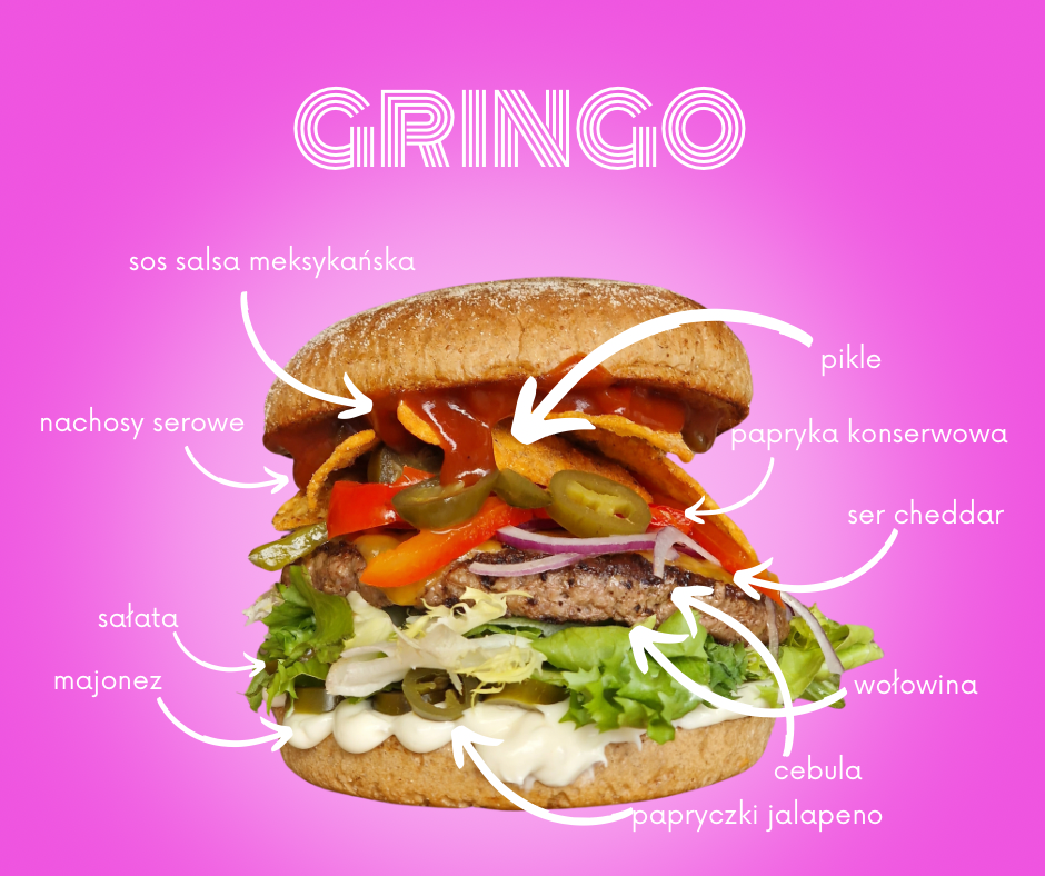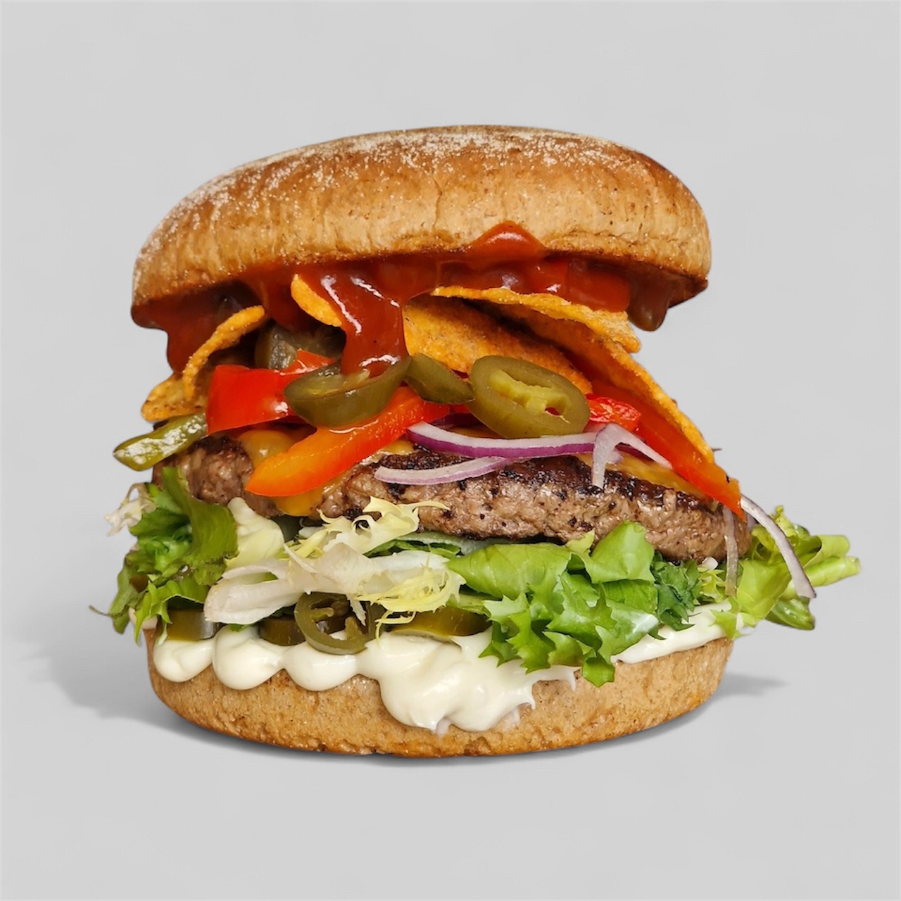 MIĘSO WOŁOWE, PAPRYKA KONSERWOWA, SAŁATA, CEBULA CZERWONA, PIKLE, SER CHEDDAR, PAPRYCZKI JALAPENO, NACHOSY, MAJONEZ, SOS SALSA MEKYKAŃSKA